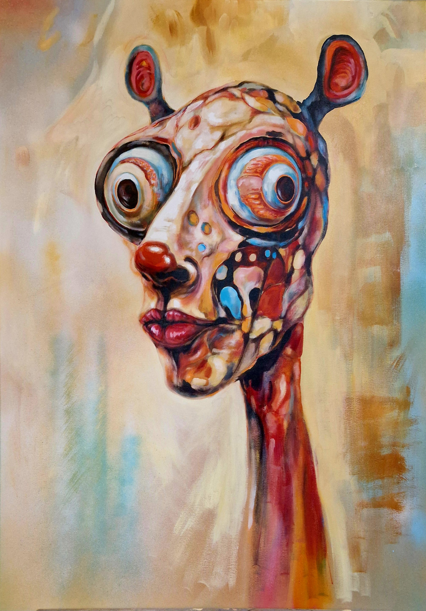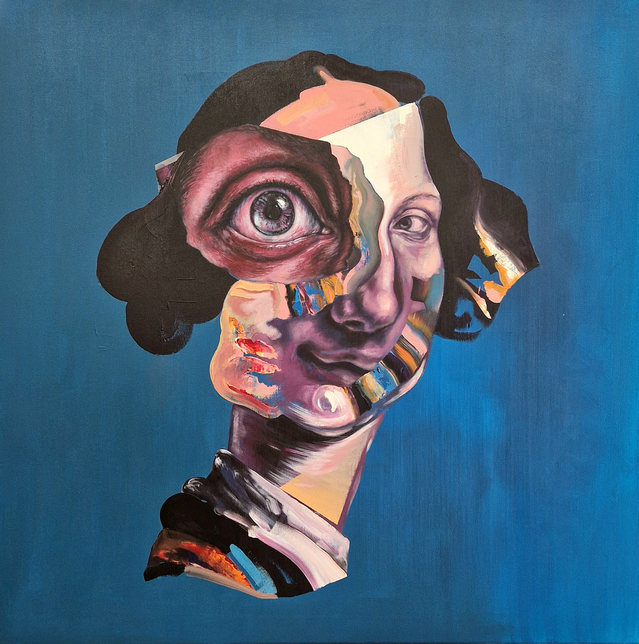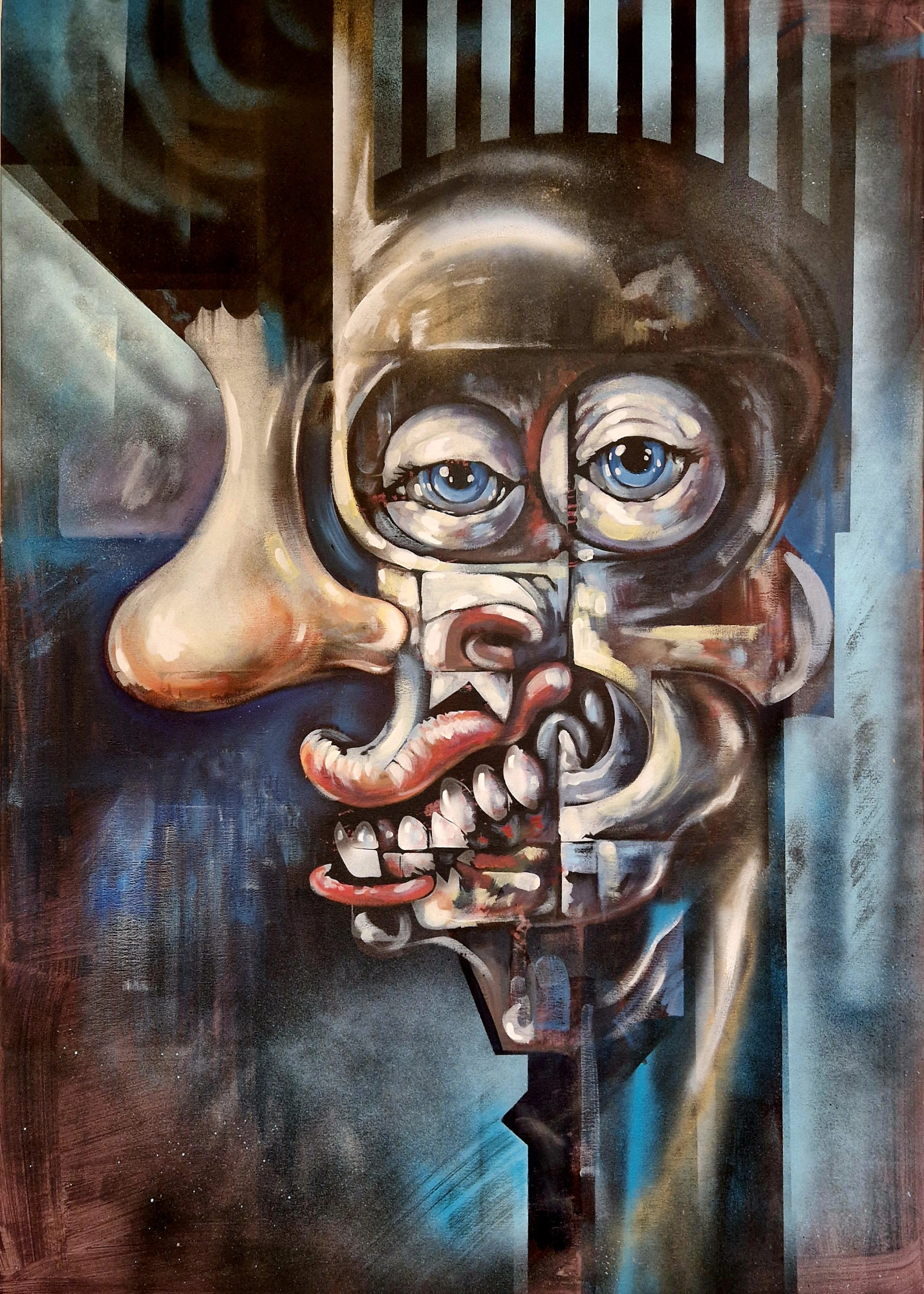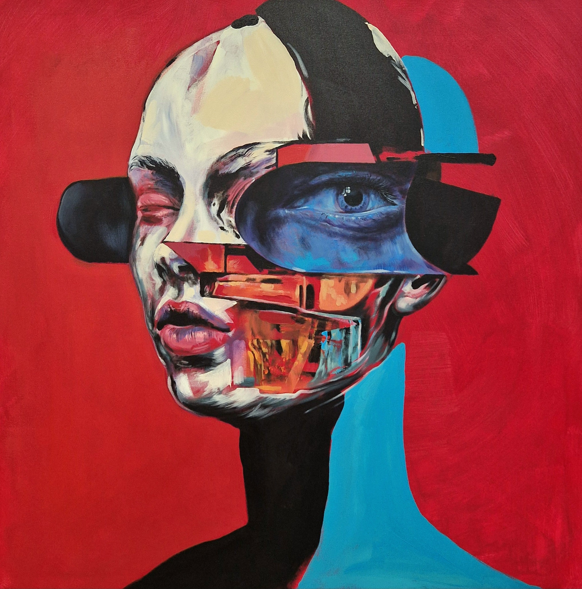 Egy 21. századi festészeti metamítosz, amelyben az arc már nem a lélek tükre, hanem geg, egy streamelhető avatár-töredék, egy algoritmikus karneváli maszk, amely szelfikből, profilképekből és filtereken átszűrt identitás-szilánkokból épül fel. Ez a bizarr, mégis játékosan kedves vizuális nyelv a pop art harsányságát ötvözi archaikusan absztrakt furcsaságokkal. Nem csupán portrét fest, hanem önképeket dekódol, mitológiát gyárt az online személyiségből. A festmények kiberhősöket, identitásépítészeket és glitchelő álarcokat mutatnak be, kissé gúnyrajz jellegű, szürreális montázs, valahol a dadaizmus, az expresszionizmus és az AI-generált képi világ határán.