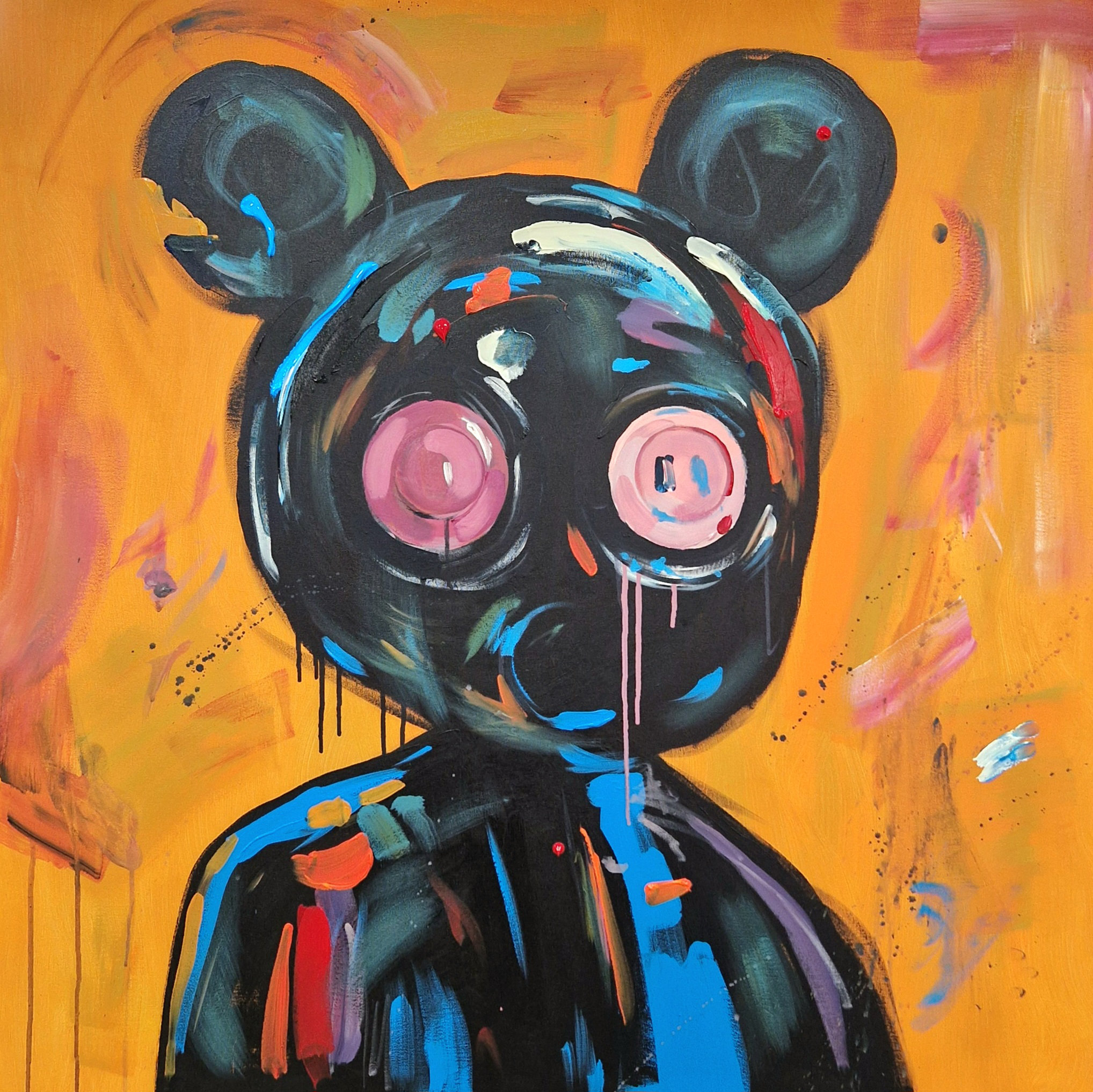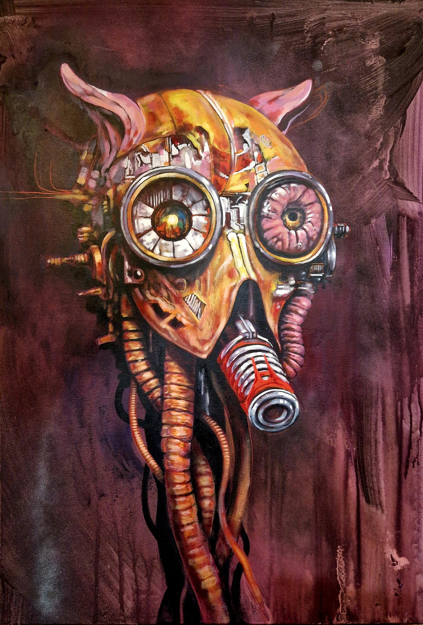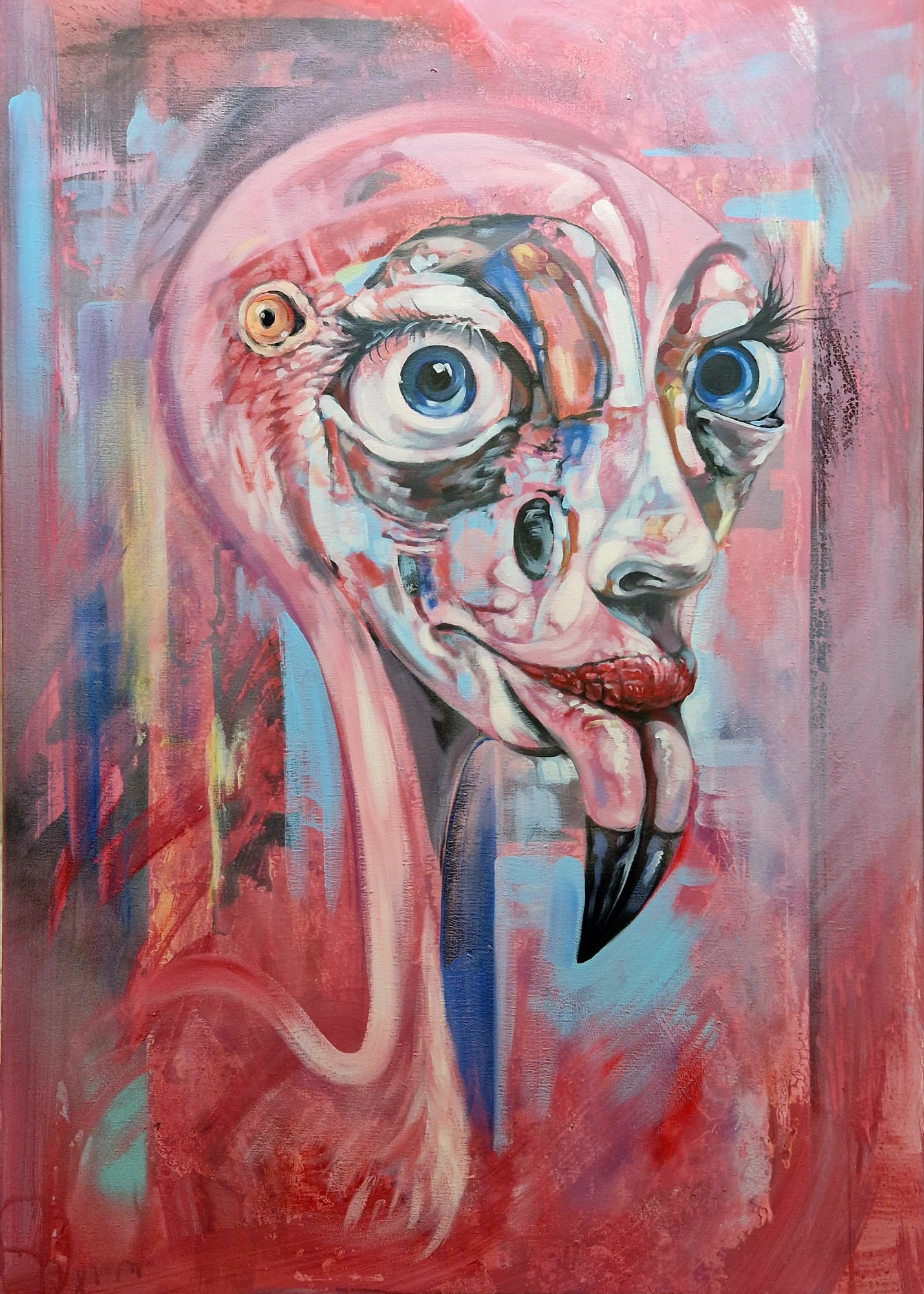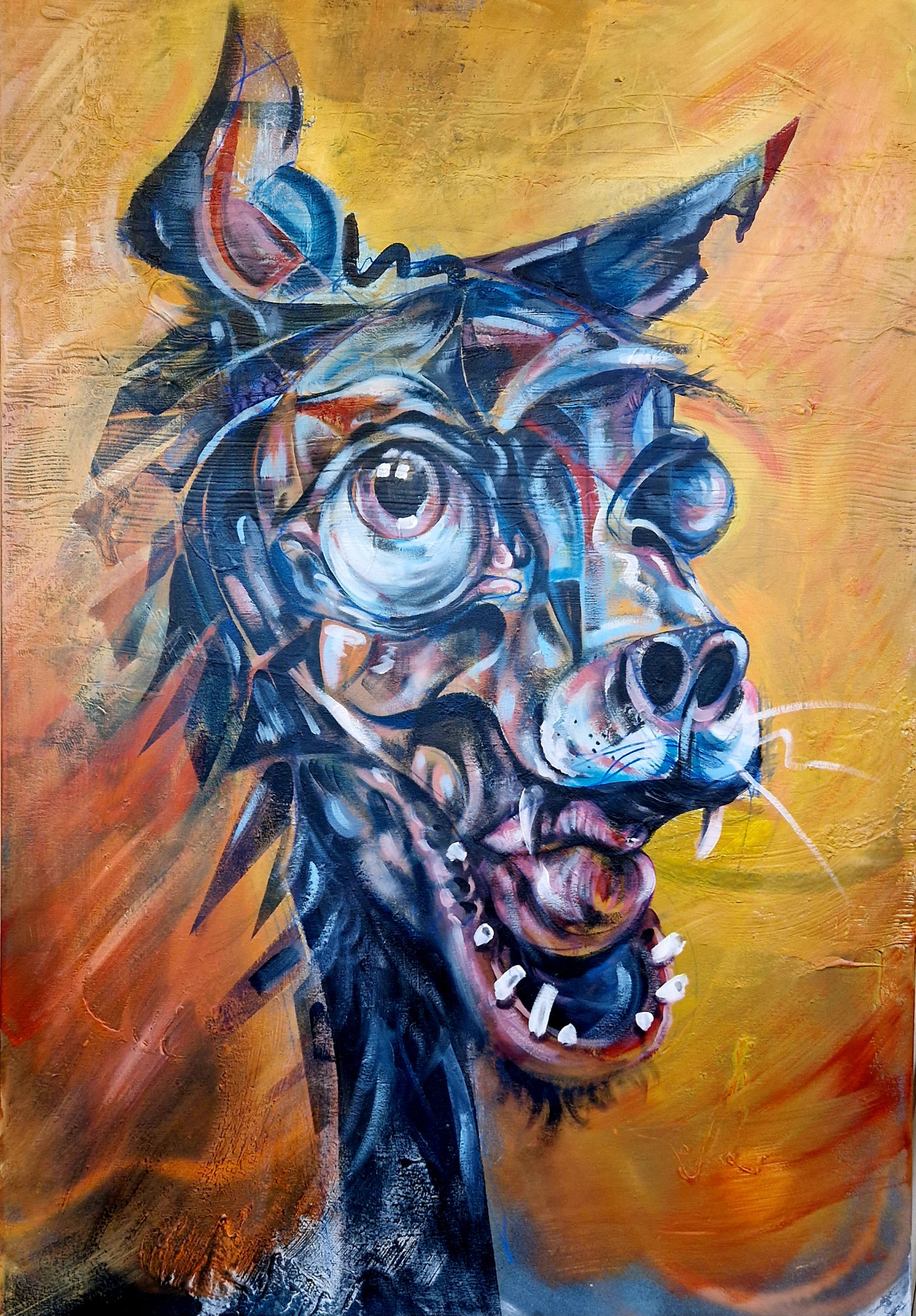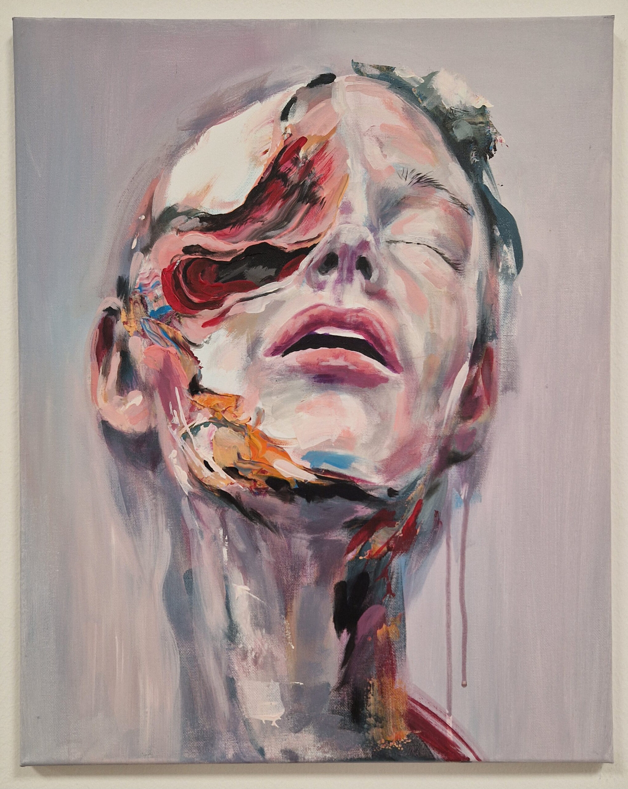 Egy 21. századi festészeti metamítosz, amelyben az arc már nem a lélek tükre, hanem geg, egy streamelhető avatár-töredék, egy algoritmikus karneváli maszk, amely szelfikből, profilképekből és filtereken átszűrt identitás-szilánkokból épül fel. Ez a bizarr, mégis játékosan kedves vizuális nyelv a pop art harsányságát ötvözi archaikusan absztrakt furcsaságokkal. Nem csupán portrét fest, hanem önképeket dekódol, mitológiát gyárt az online személyiségből. A festmények kiberhősöket, identitásépítészeket és glitchelő álarcokat mutatnak be, kissé gúnyrajz jellegű, szürreális montázs, valahol a dadaizmus, az expresszionizmus és az AI-generált képi világ határán.
