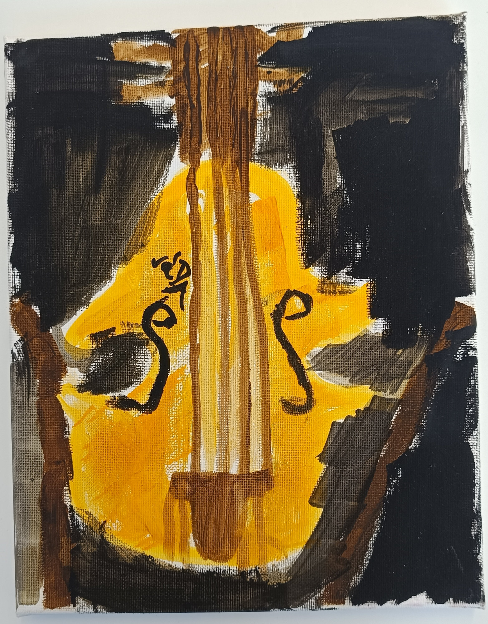 Sárga hegedű, 25 x 30 cm, akril, vászon, 32.000 Ft